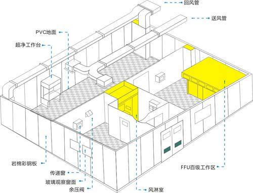 千級潔凈室之定義為將一定空間范圍內之空氣中的微塵粒子、有害空氣、細菌等之污染物排除,并將室內之溫濕度、潔凈度、室內壓力、氣流速度與氣流分布、噪音震動及照明、靜電控制在某一需求范圍內,而所給于特別設計之密閉空間。